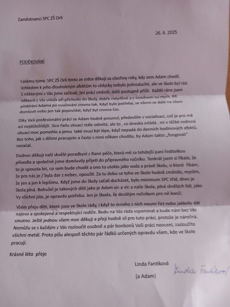V červnu ukončili docházku na naší škole 3 žáci. Toto je poděkování celému týmu speciální školy Orlí od maminky Adama – jednoho z těchto žáků.