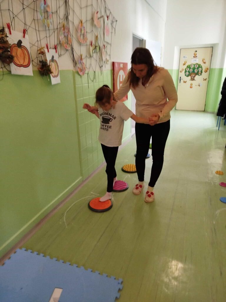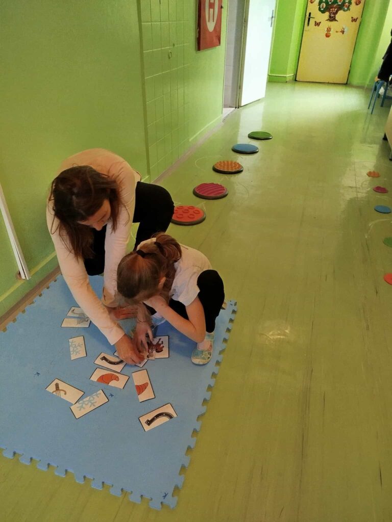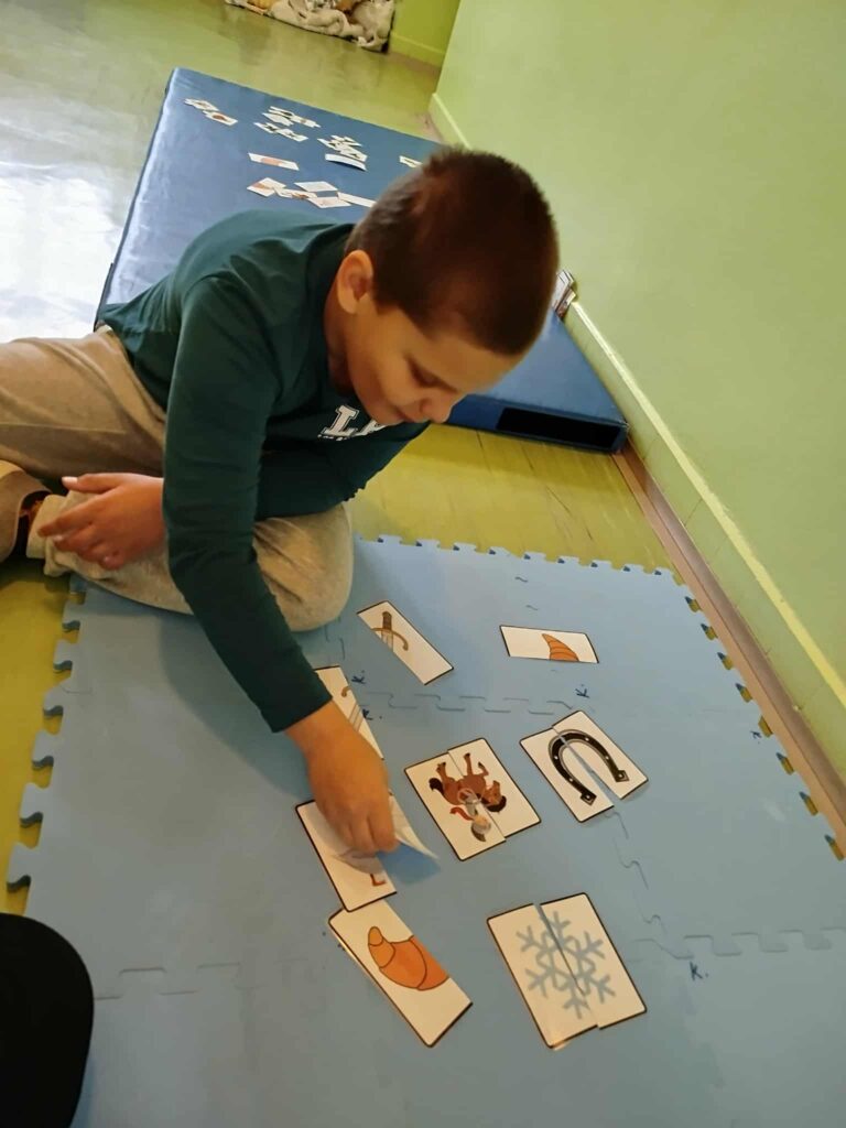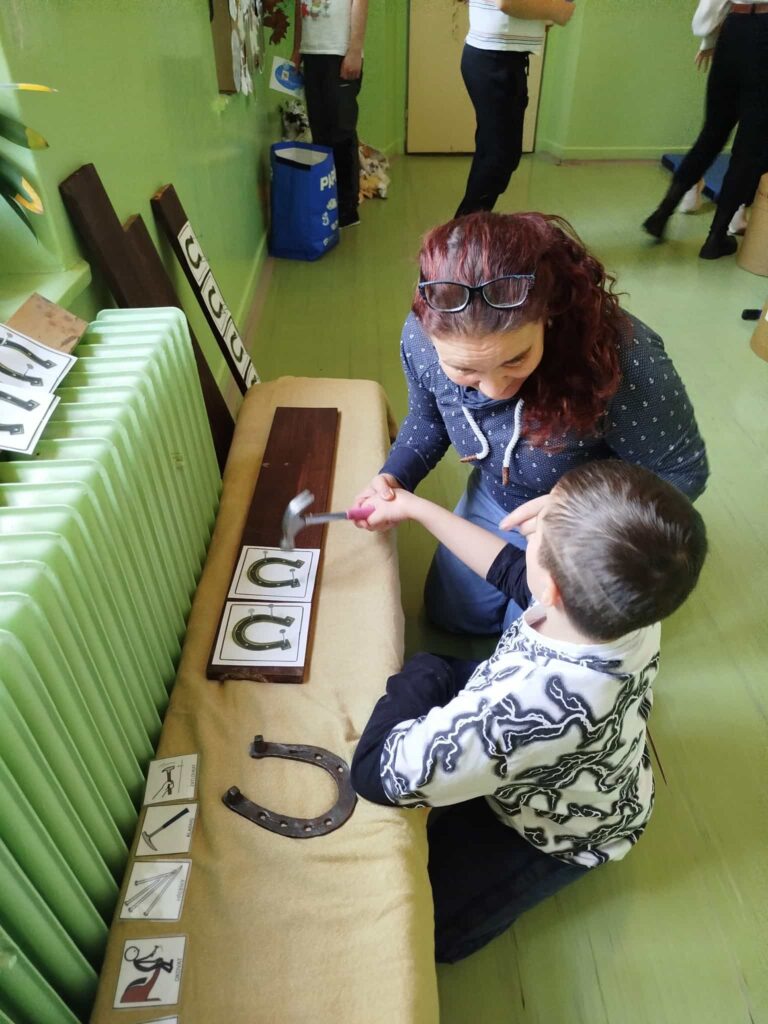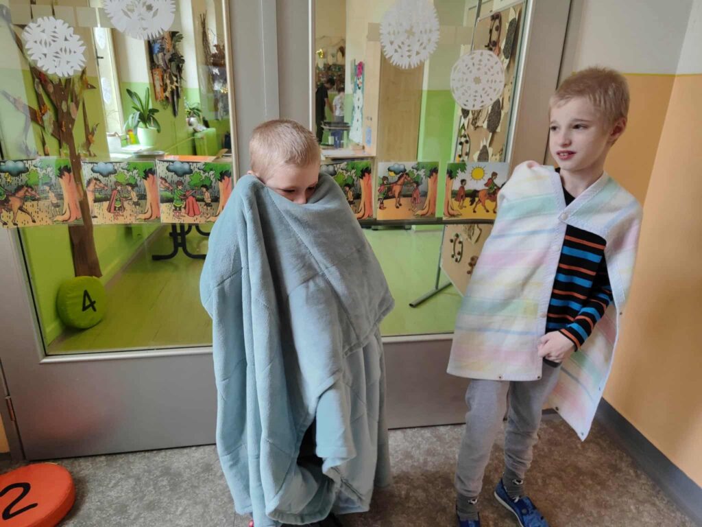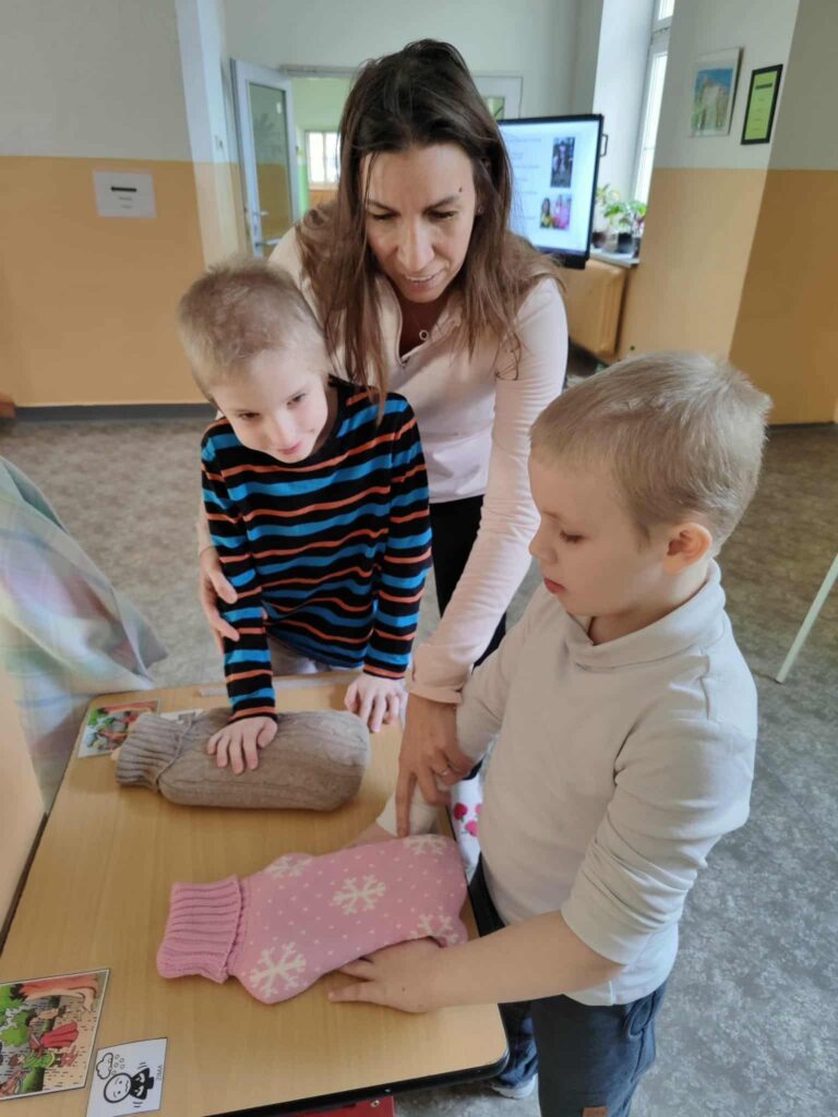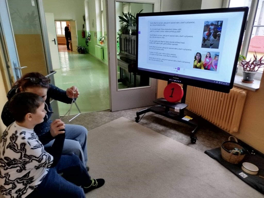 Projektový den Svatomartinská cesta na nás čekal na chodbě naší školy. Každé dítě se stalo na chvíli sv. Martinem, který je znám nejen tím, že „přiváží na svém bílém koni první sníh“, ale hlavně svým dobrým skutkem, kdy si odřízl kus svého pláště, aby zachránil prochladlého žebráka. Děti si zamuzicírovaly s písničkou o sv. Martinovi, vyzkoušely si teplo a chlad, vrátily peří svatomartinské huse, zatloukly hřebíky do koňské podkovy, prošly se po taktilním chodníčku a pracovaly s půlenými obrázky či stíny. Den se vydařil natolik, že venku opravdu začalo i reálně sněžit.