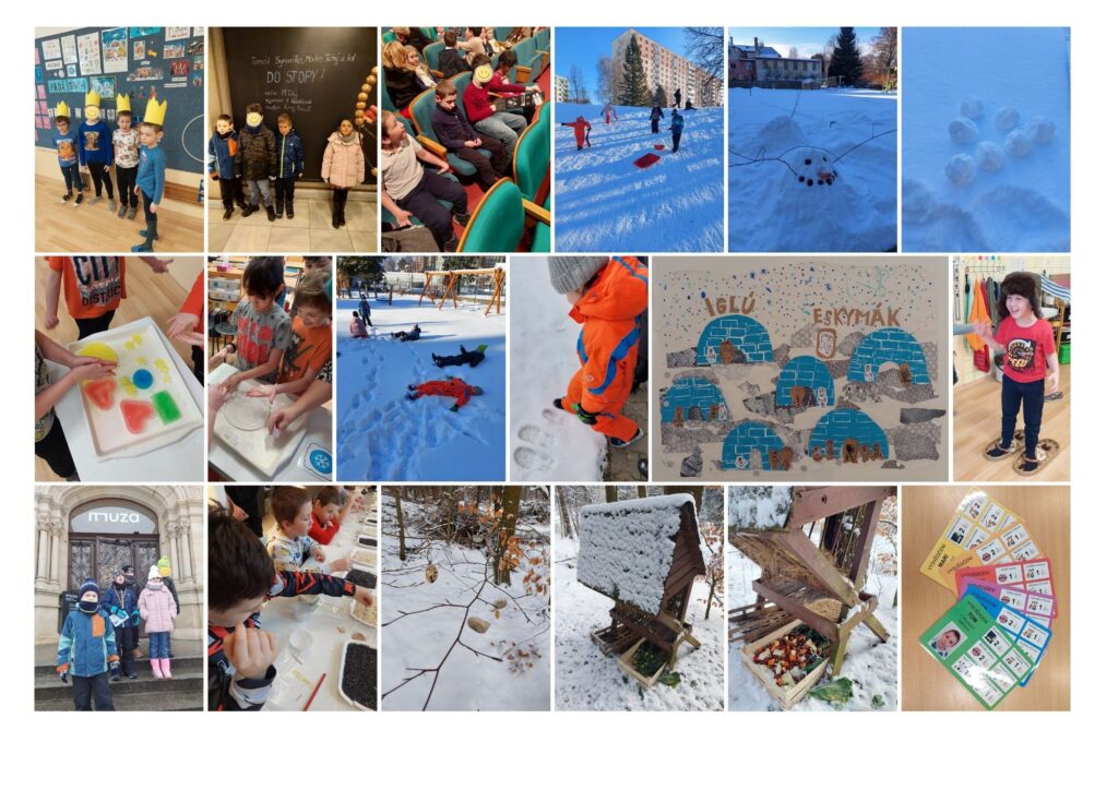 Na začátku měsíce jsme si představili další zimní svátek, SVÁTEK TŘÍ KRÁLŮ. Stavěli jsme sněhuláka, dělali sněhového anděla a házeli na cíl sněhovými kouličkami. Zkoumali sníh, pozorovali námrazu nebo jezdili na bobech a ježdících. Také jsme si představili techniku otisku a společně vyrobili velký plakát s Eskymáky a iglú.