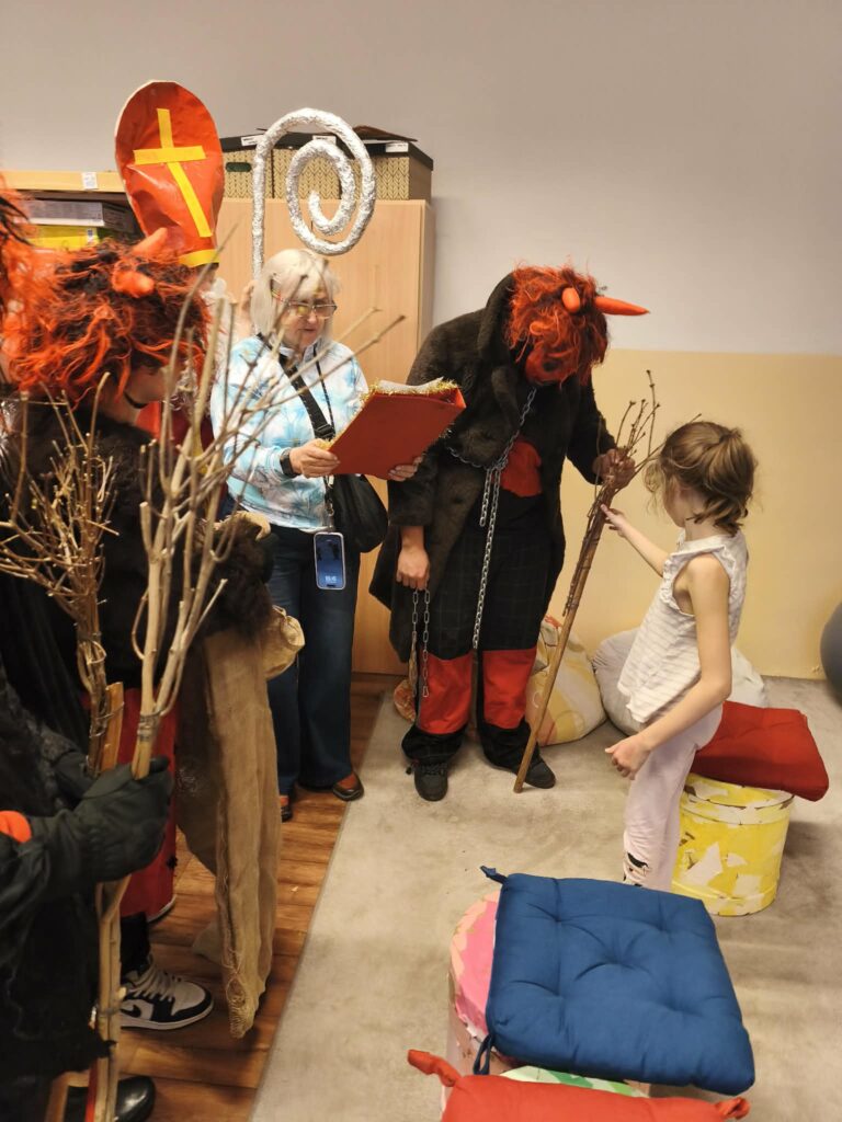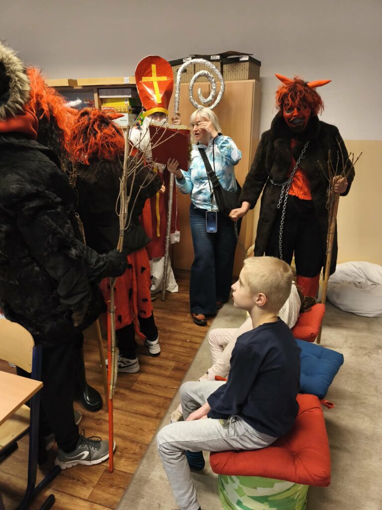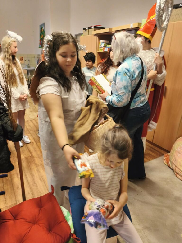 K nám do třídy se přišel podívat Mikuláš! A nebyl sám. Provázeli ho krásní andělé, ale i pořádně zlobiví čerti. Děti se jich nebály, naopak, všechny členy vzácné návštěvy si prohlédly, nechaly se anděly pohladit po vlasech a od Mikuláše dostaly ještě dobroty, protože byly celý rok hodné. Návštěvy s dobrotami máme moc rádi 🙂 .