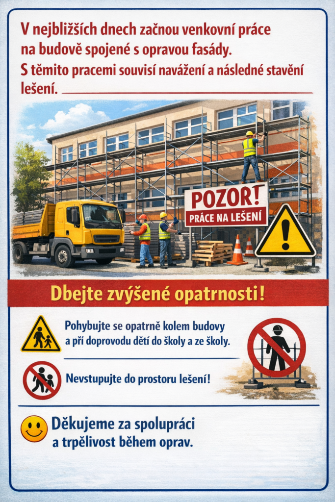 V nejbližších dnech začnou venkovní práce na budově spojené s opravou fasády. S těmito pracemi souvisí navážení a následné stavění lešení.